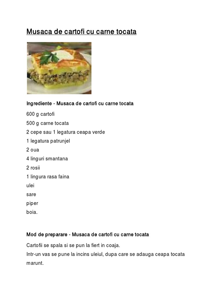 Un kg carne tocată de vită si porc, 6 cartofi mari, 3 cepe, o legătură mărar, 4 rosii mari, sare , piper, 2 căţei de usturoi , 100 ml pastă de tomate peste ultimul rand cu cartofi se asează un strat de rosii feliate si se presară cascavalul ras. Musaca de cartofi cu carne tocată și smântână (cartofi la cuptor în 9 pași). Se pun la baza o treime din cartofii feliati, apoi jumatate din compozitia de carne tocata si deasupra se presara jumatate din cascavalul ras. Se curata cartofii si se taie rondele. Sunt multe mancaruri delicioase din carne tocata cu legume, gen musaca.